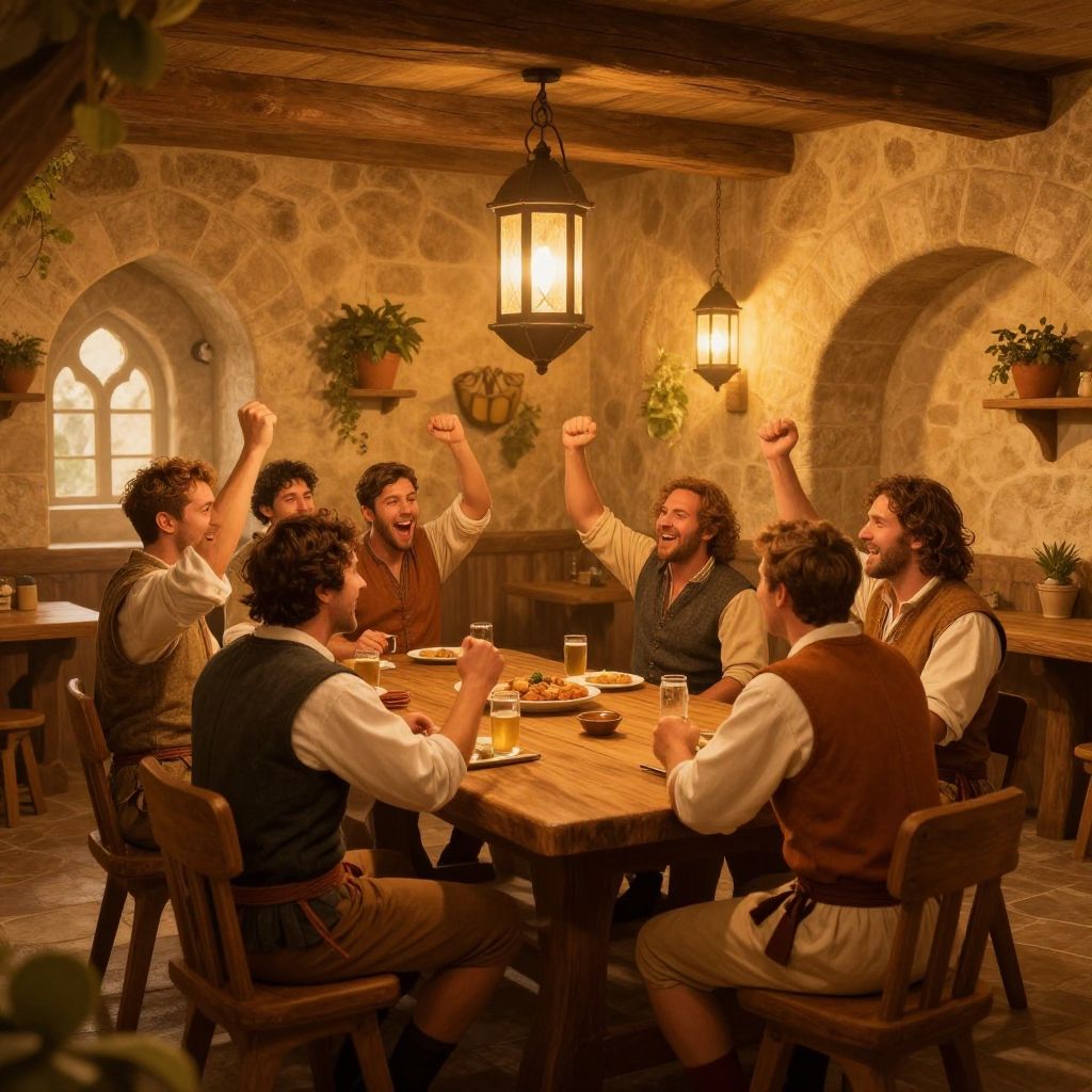 Illustration of a joyful group of men gathered around a wooden table in a warmly lit medieval stone tavern. The men, dressed in traditional medieval attire with vests and tunics, are enthusiastically cheering and celebrating. Hanging lanterns and potted plants decorate the rustic interior with stone archways and wooden beams.