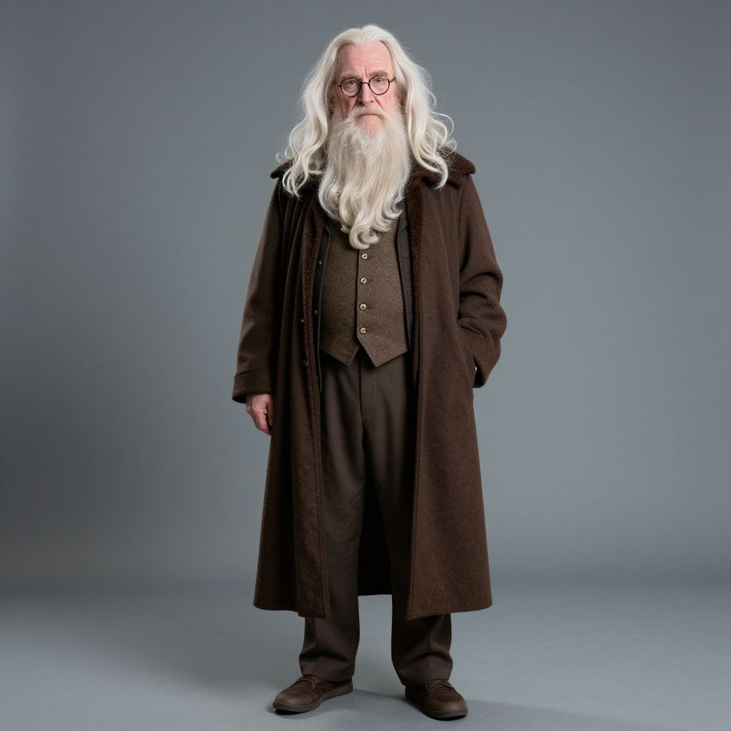 Photograph of an elderly man with long, wavy white hair and a full white beard. He wears round glasses, a dark brown waistcoat over a matching shirt, black trousers, and brown shoes. Over his outfit, he dons a long, dark brown overcoat. He stands against a plain, gradient blue-gray background with his hands in his coat pockets. The lighting is even, highlighting his distinguished, wise appearance. The overall style evokes a classic, wise, and slightly mysterious figure.