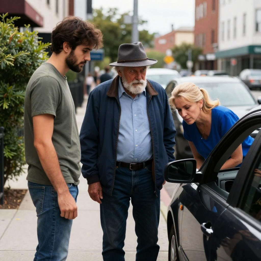 Three people standing on a city street. Bearded man with dark hair and sunglasses, wearing a green shirt and black t-shirt, looks left. Blonde woman with a blue coat and patterned skirt, shoulder bag, looks forward. Older man with gray beard, brown hat, blue jacket, beige shirt, looks downward. Background: narrow street with buildings, parked cars, red awning.