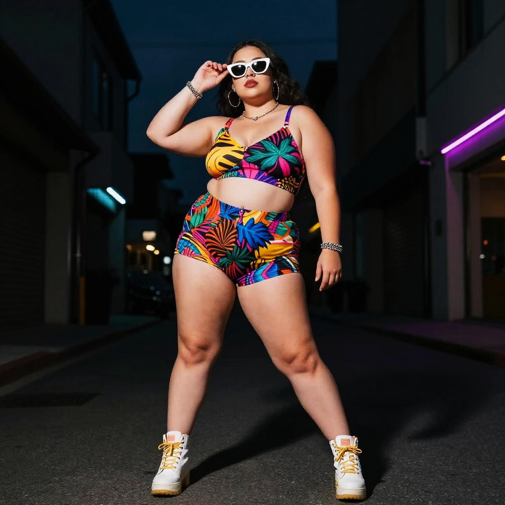 Curvy weight gain fashion portrait, urban street style, bold patterns and accessories, strong dynamic pose, moody lighting with neon accents, high contrast, editorial vibe