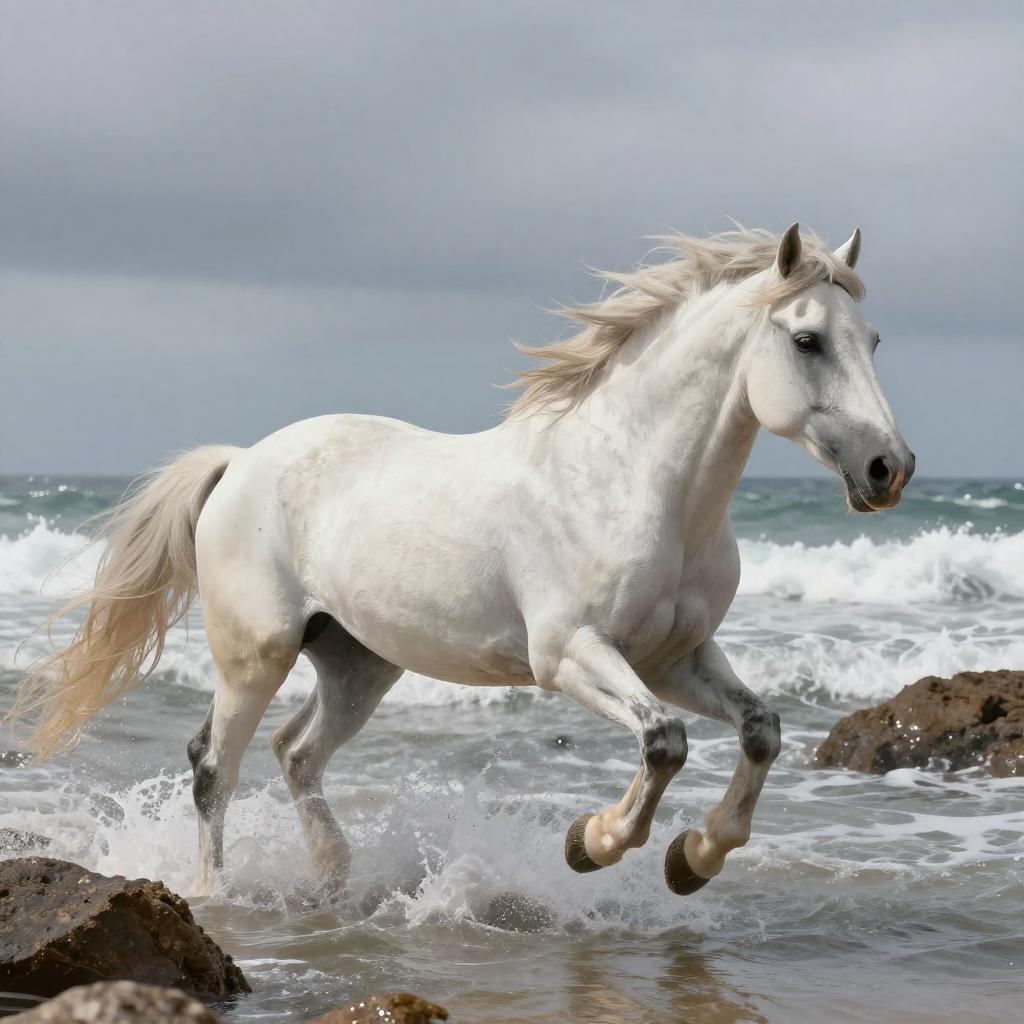 Digital illustration of a white horse with flowing mane running energetically in shallow ocean water near rocky formations, with waves crashing in the background under a cloudy gray sky.