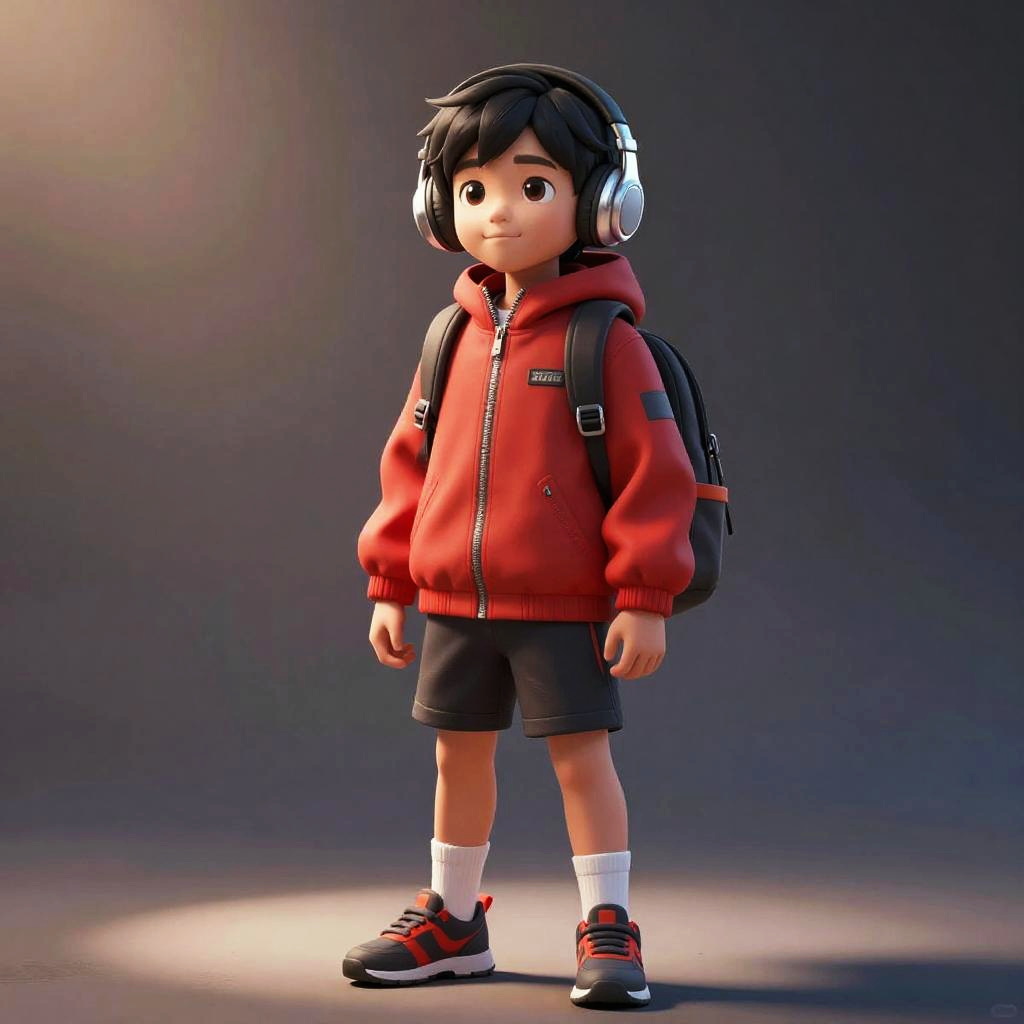 Realistic photo of a cartoon-style male character wearing a white t-shirt and a colorful floral crown, standing against an urban textured concrete wall. The character has black hair and large expressive eyes, blending animated design with realistic photography.