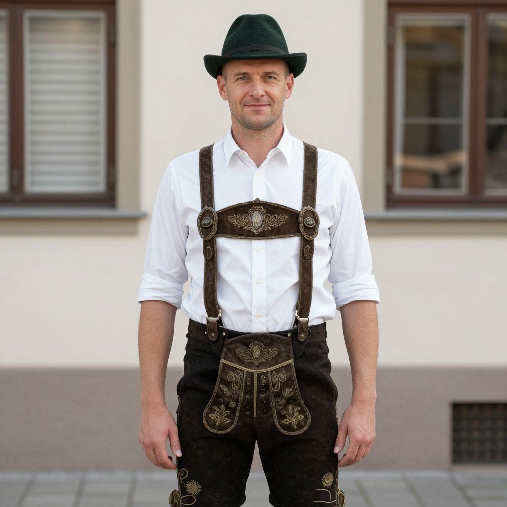 Traditional Lederhosen Oktoberfest Man Costume, man with a hat and suspenders standing in front of a building