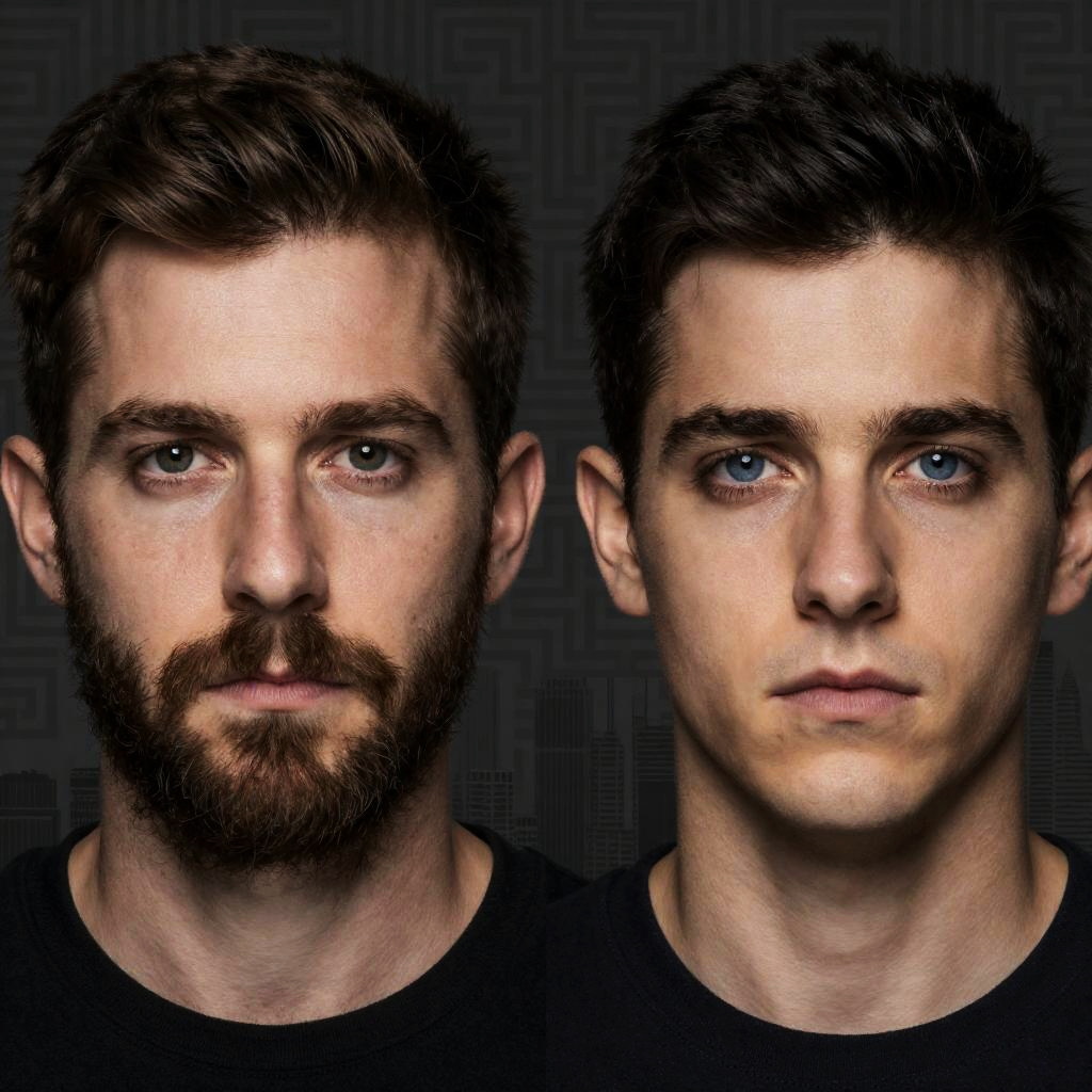 Photograph of two men's faces side by side. Left: bald black man with intense expression, dark skin, serious eyes. Right: white man with short brown hair, intense expression, light skin, slightly furrowed brow. Blue background. Both in dark clothing.