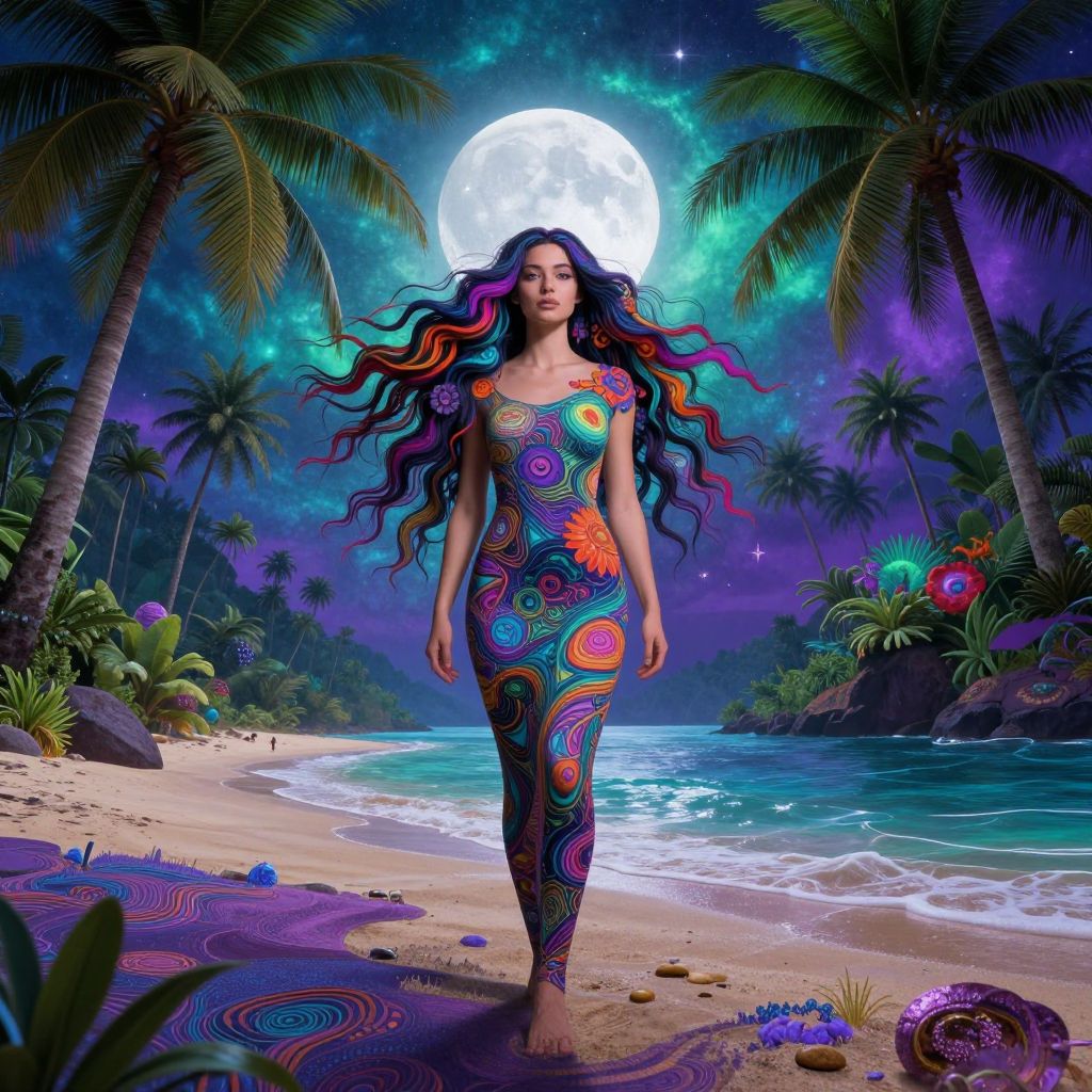 Digital artwork of a woman with long, wavy, multi-colored hair in a psychedelic dress, walking on a tropical beach under a full moon and star