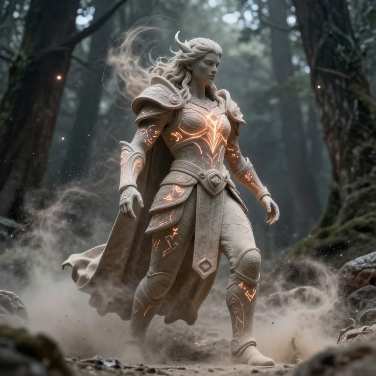 Powder arcane full body figure standing in a mystical forest, swirling magical dust particles around them, glowing runes etched on their armor, ethereal light illuminating their form, detailed textures blending fantasy and realism, cinematic lighting, dynamic pose.