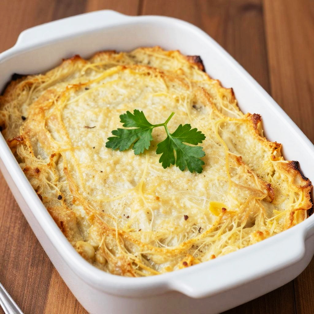 Photograph of a grilled, caramelized fish fillet with crispy edges, garnished with fresh parsley on a white plate, fork to the right,