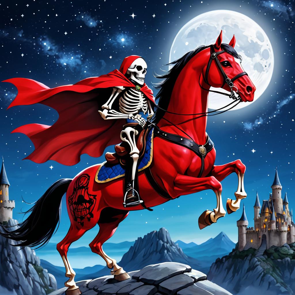 Moon, horse, skeleton, riding, horseback riding, night, skull, full moon, cape, sky, castle, night sky, wings, star (sky), saddle, armor, 1boy, solo, reins, male focus, red cape, outdoors, starry sky, no humans, animal
