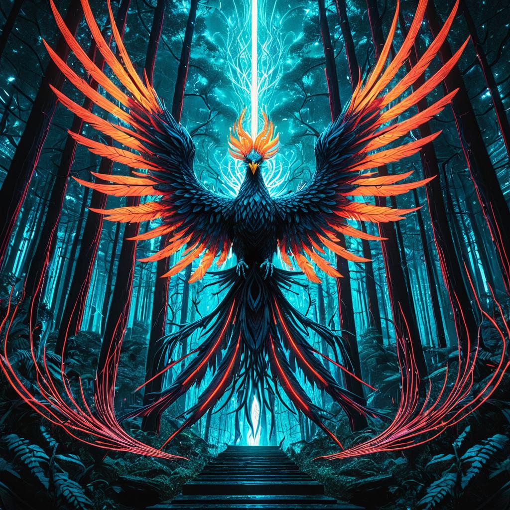 Ethereal Phoenix in Neon Cyber Forest