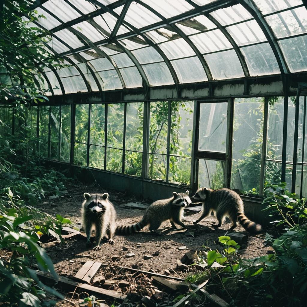 Raccoons breaking into a rustic barn, nighttime scene, mischievous mood, dark lighting, realistic forest background