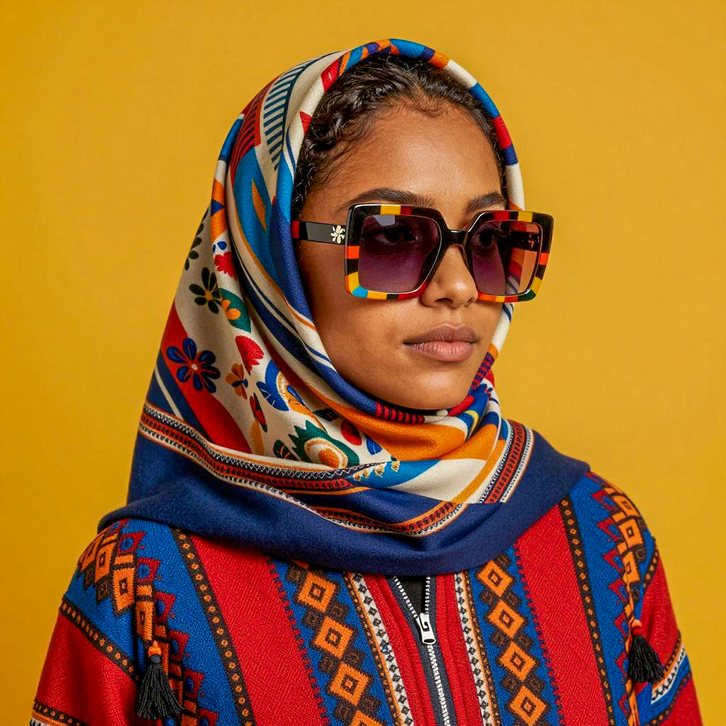 Photograph of a person with medium brown skin wearing a colorful patterned headscarf, large square sunglasses with multicolored frames, and a vibrant, patterned jacket with red, blue, and orange details. Bright yellow background. Person looks to the side with a neutral expression. Headscarf has geometric and floral designs. Jacket has intricate patterns and tassels.
