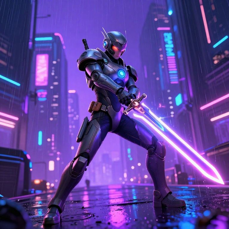 Cybernetic warrior with glowing purple sword stands in neon-lit, rainy city street, holding stance with illuminated futuristic armor. Digital art.