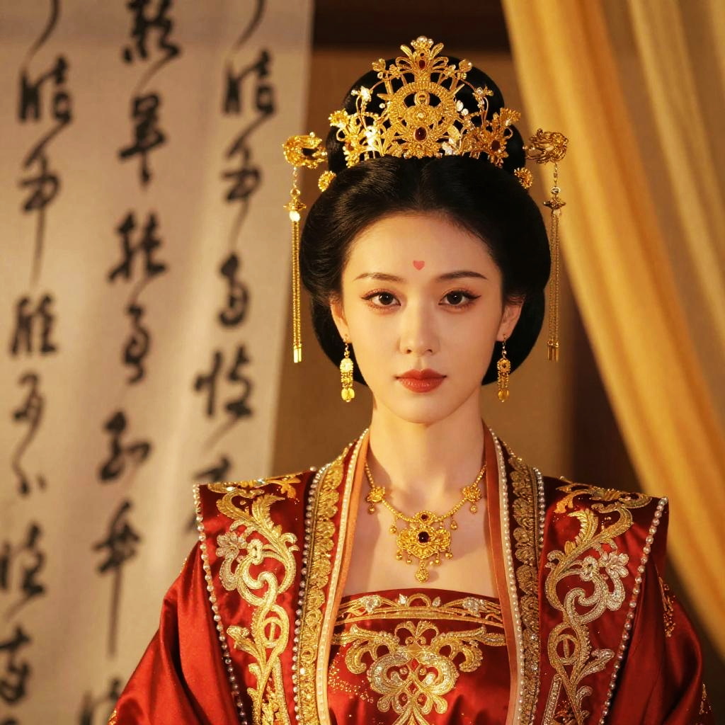 Photograph of an elegant Asian woman with fair skin and black hair styled in an elaborate updo adorned with a golden, ornate crown. She wears a rich, red and gold embroidered robe with intricate patterns, and matching gold jewelry, including earrings and a necklace. The background features yellow curtains with black calligraphy, and soft, warm lighting. She looks poised and regal, with a calm expression.