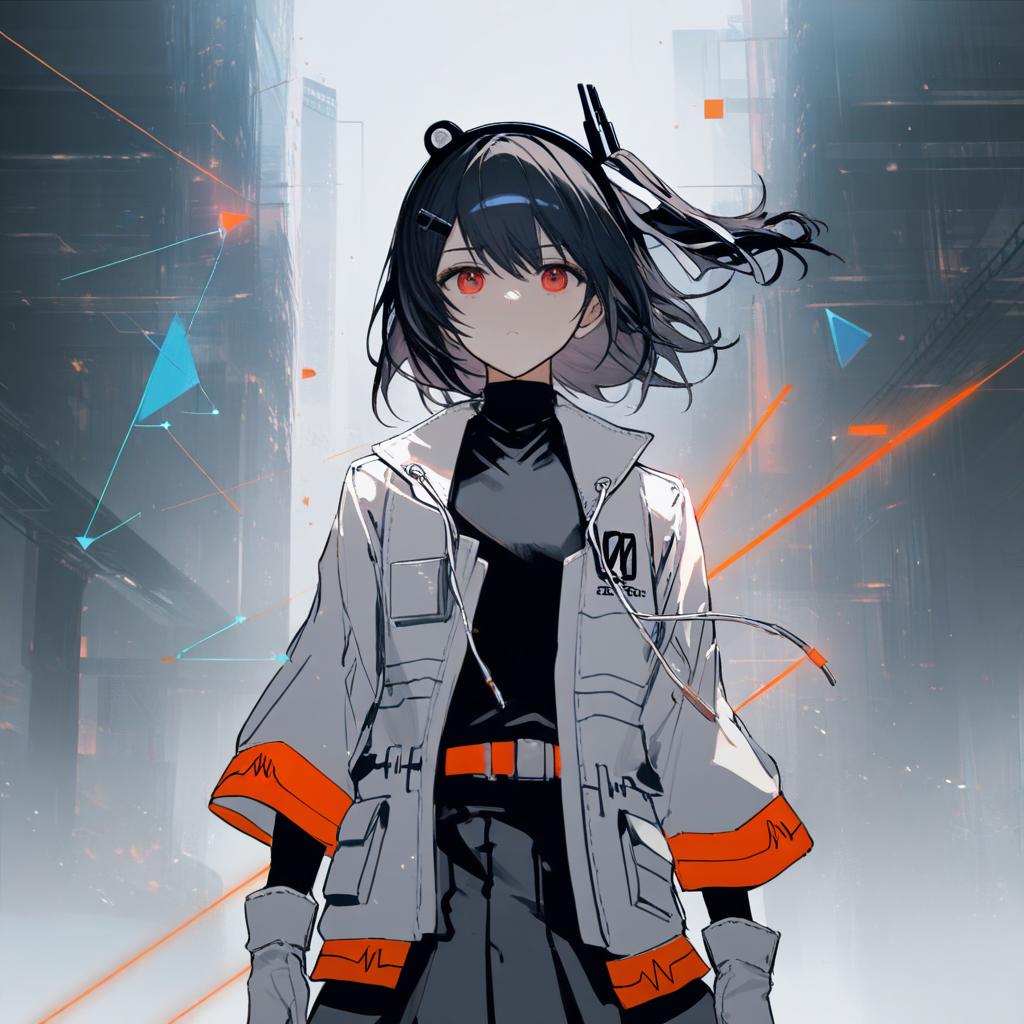 Cowboy shot, adachi rei, 1girl, solo, orange eyes, purple hair, white jacket, white gloves, skirt, floating hair, looking at viewer, expressionless, geometric elements, glowing, urban setting, cloudy overcast night, vintage poster style with grainy texture, intense stares ascion