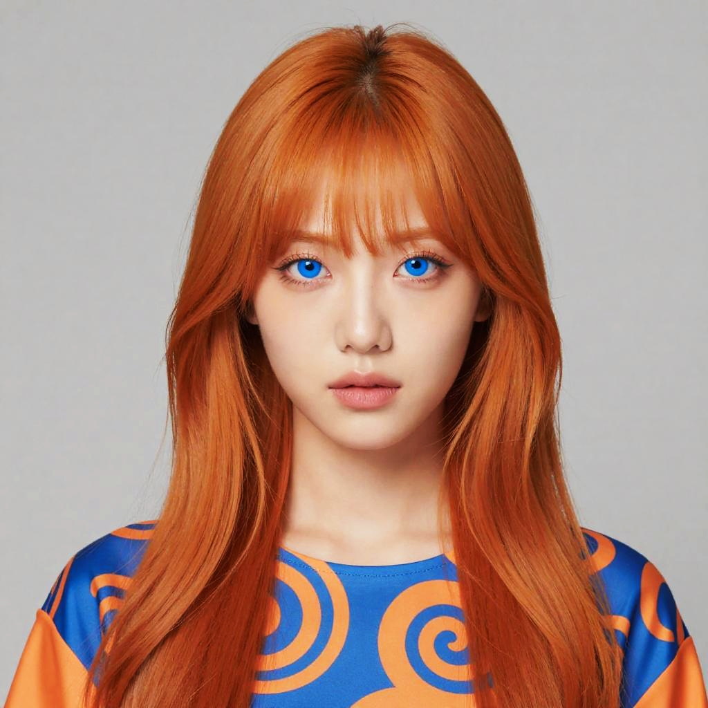 This is a hyper-realistic digital portrait of a young woman with striking blue eyes and vibrant orange hair. Her hair has bangs that frame her face, and she's wearing a colorful outfit with bold, swirling patterns in blue and orange. Her skin is fair, and her lips are a soft pink. The background is a plain gray, making her features pop.