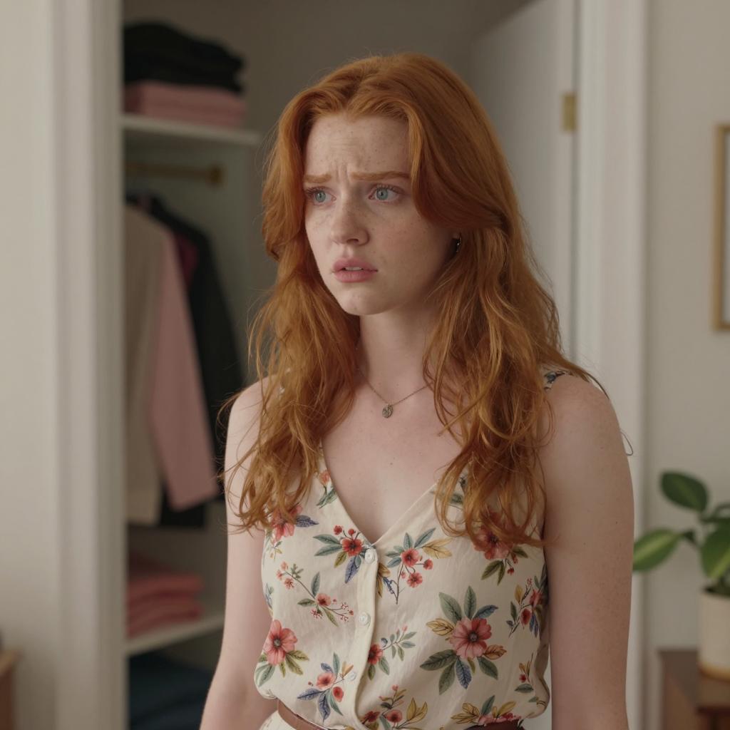 Three women in a locker room. Central woman with red curly hair, black strapless top, and blue skirt, looking surprised. Woman on right with brown hair in blue bra, embracing central woman. Woman on left with bald head, red tank top, moving towards left. Red lockers in background, bags on top. Bright lighting.