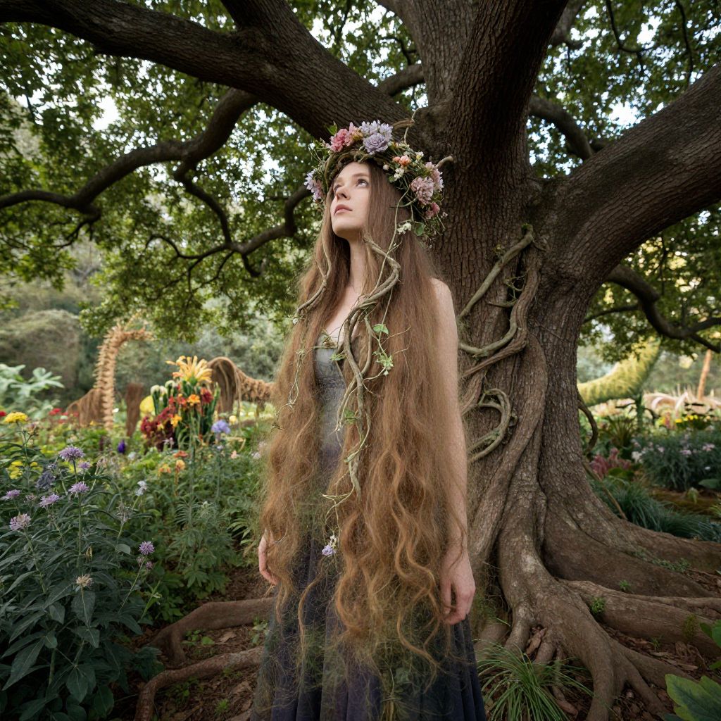 Photograph of a young woman with long, wavy, honey-brown hair adorned with a floral crown of pink and white flowers. She wears a dark, flowing dress and stands in front of a large, gnarled tree with thick branches. The background features a vibrant garden with colorful flowers, including sunflowers and purple blooms, and a whimsical, red giraffe sculpture. The scene is lush and green, with sunlight filtering through the tree leaves. The woman's ethereal appearance and the enchanted garden setting evoke a fairy-tale atmosphere.