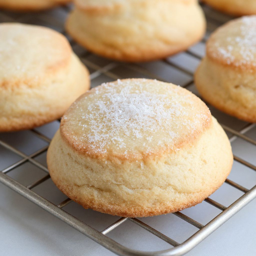 Photograph of five golden-brown, round, sugared muffins on a metal cooling rack. The muffins have a slightly domed top and a light dusting of granulated sugar. The cooling rack is positioned diagonally, with the muffins spaced evenly. The background is blurred but shows a white surface. The texture of the muffins appears soft and slightly crumbly, with a light, airy consistency. The lighting is bright, emphasizing the muffins' golden color and sugar glaze.