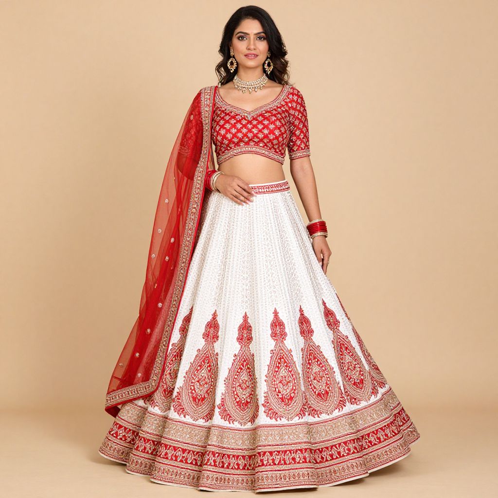 Lehenga Choli Woman Costume, a woman in a white and red lehenga with a red blouse