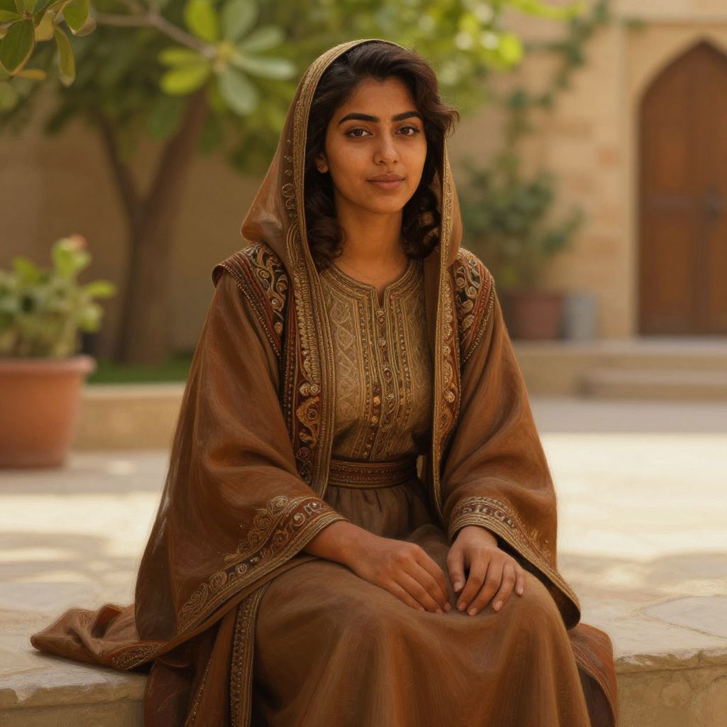 Photograph of a young South Asian woman with medium brown skin and dark brown eyes, sitting on a stone bench in a sunlit courtyard. She has long, wavy black hair partially covered by a brown embroidered headscarf. She is wearing a matching brown embroidered traditional dress with intricate patterns. The background includes blurred green foliage and a beige stone wall with a wooden arched door. She sits with a calm, composed expression, her hands resting on her lap. The image has a warm, natural light, highlighting the texture of her clothing and the serene setting.