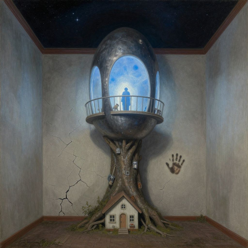 A surreal imagenious style painting depicting a man’s head in profile, with a large round window embedded into his skull like a ship’s porthole, The window has ominous engravings etched around its frame and is scratched, distorting the view inside, Through the glass, a dimly lit interior is visible: a small, simple room with a wooden table and chair, A solitary figure sits at the table, his face hidden as he cradles his head in his arms, evoking a sense of despair and isolation, The overall mood is dark and atmospheric, with muted tones and subtle glowing highlights around the engravings