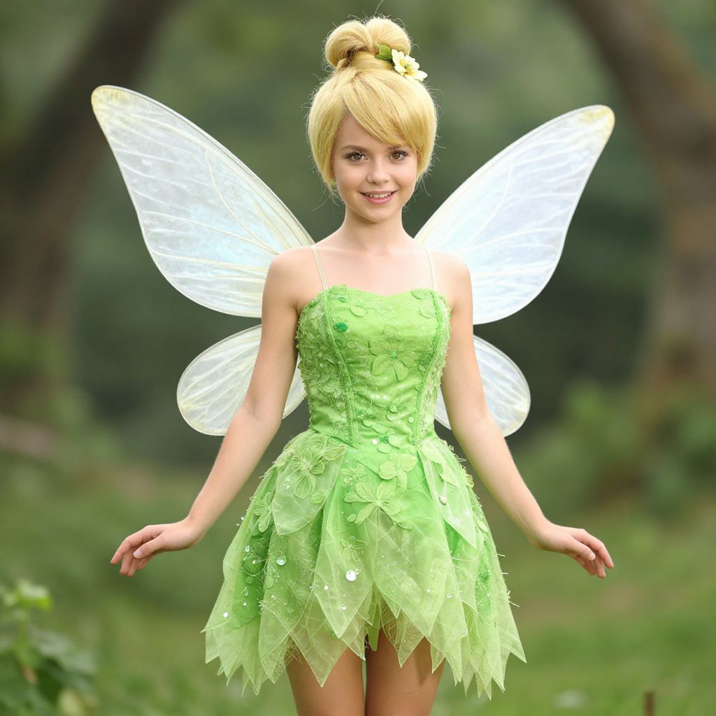 Tinker Bell Pirate Fairy Costume, fairy tinker in a green dress with a flower in her hair