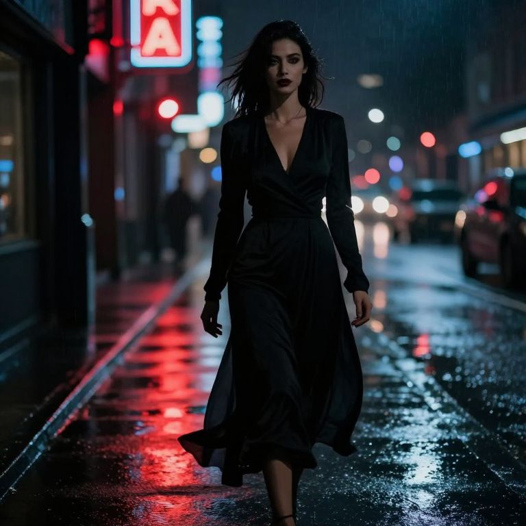 A mysterious femme fatale in a flowing black dress walks through a rain-soaked city street at night, her silhouette framed by neon signs casting long shadows, her face illuminated only by a single red lamp, expression enigmatic and seductive, with deep shadows under her eyes and sharp, defined features.