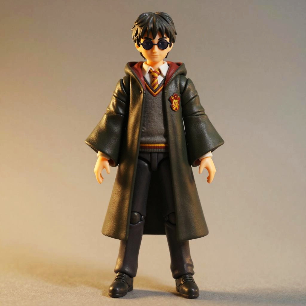 Realistic photo.Male Nendoroid figure of Harry Potter from Harry Potter series, with short black hair, sunglasses, product photography style, olive color tone, soft lighting, warm hues, detailed textures, inspired by Brian Froud realistic photo