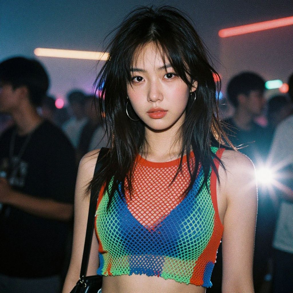 Photograph of an Asian woman with straight black hair, wearing a colorful mesh crop top, standing in a dimly lit, neon-lit crowd.