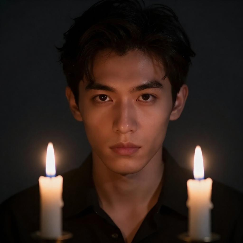 Photograph of a young man with dark hair and intense gaze, illuminated by two lit candles in a dark background. He wears a black shirt, with one candle on the left and one on the right. His expression is focused.