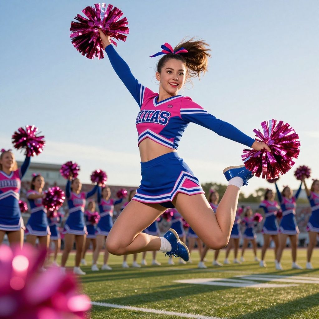 (25 years old, large covered breasts, cleavage, skinny, slender, young woman:1.5), (Oval-shaped face, luminous complexion, Bright almond-shaped eyes, Arched defined eyebrows, retrouss├й nose, bow-shaped lips:1.2), (style of Richard Avedon), high school football field, late afternoon golden sunlight, ((striking cheerleader in uniform)), vibrant magenta blue team colors, dynamic pose mid-jump, flowing magenta pom-poms, sleek blue athletic shoes, crisp, tailored uniform, intricate embroidery, modern cheerleading fashion model fusion, youthful energy, backdrop of enthusiastic crowd, clear blue sky, hint of team spirit in every detail, facial expression conveying excitement and confidence, detailed texture of uniform fabric, subtle gleam of a small, elegant team pin on chest, hairstyle in a high, spirited ponytail with magenta and blue ribbons, makeup bold yet tasteful, emphasizing the eyes, action shot capturing the essence of team spirit and modern cheerleading fashion (Layered Depth, Parallax Effect, Soft focus foreground:1.3), (wide angle, cinematic establishing shot, highly detailed background:1.2), volumetric lighting, subsurface scattering, dynamic pose, (special effects, color grading, fantasy aura), (whimsical atmosphere:1.1), (powerful energy:1.1), vibrant colors, (detailed:1.05), (intricate:1.03), cinematic lighting, (intricate:1.04), (adorned:1.09), (Layered Depth