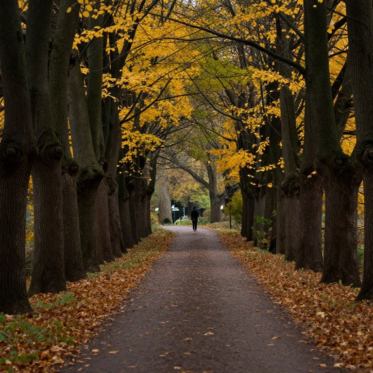 Amidst the hushed embrace of ancient trees, a winding path draped in golden leaves whispers secrets of transience, inviting introspection into the delicate balance between solitude and connection.