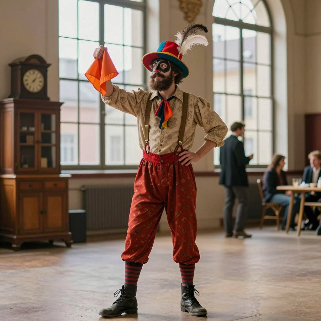 Wacky wednesday outfit, photograph of a male street performer, standing in a grand hall, full body shot, vintage circus outfit, colorful hat with feathers, beige patterned shirt, brown suspenders, red patterned pants, black boots, striped red and gray socks, black painted face, mustache, brown beard, holding orange cloth, background with tall windows, wooden cabinet with clock on the left, blurred people in the background, daylight, realistic style, detailed ures, high contrast, professional lighting