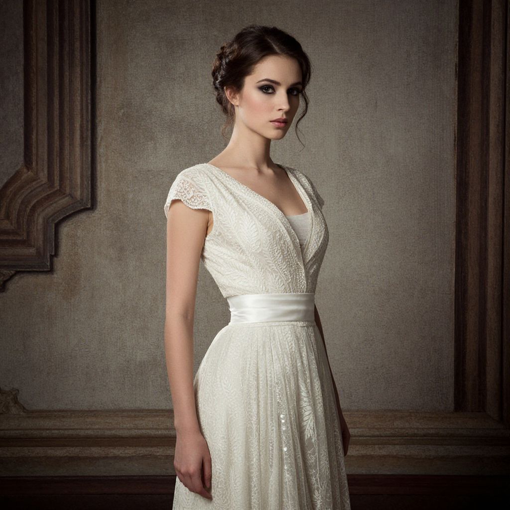 Photograph of a slender, fair-skinned woman with dark brown hair styled in an elegant updo. She wears a white, lace-trimmed, V-neckline, short-sleeved dress with a fitted waist and flowing skirt. Her makeup is subtle with defined eyebrows and nude lips. She stands against a textured, dark gray wall with ornate wooden paneling on the left. The lighting is soft, highlighting her dress's delicate lace pattern and her smooth skin. The overall style is sophisticated and timeless, with a classic, vintage ambiance.