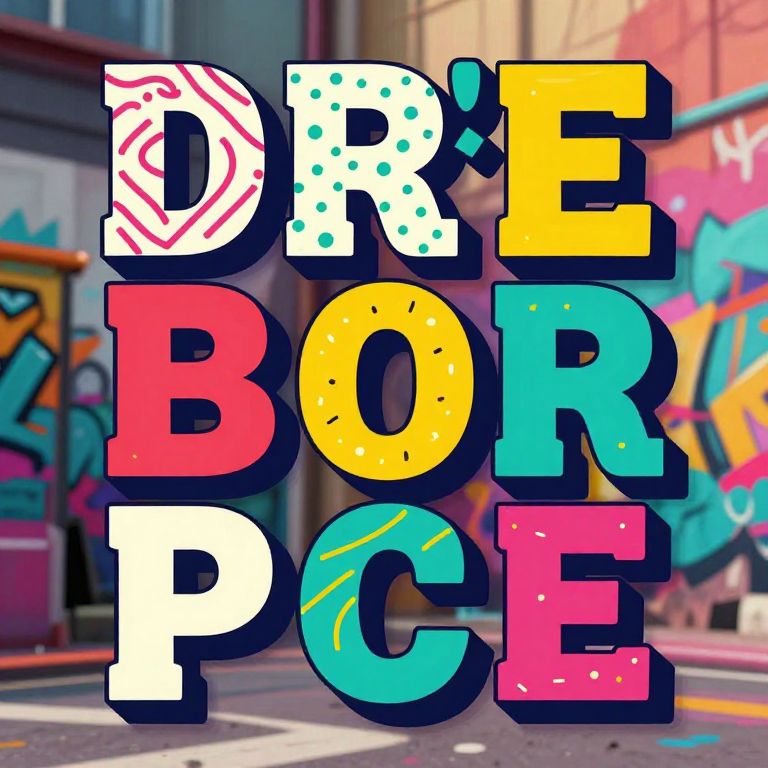 Photograph of a vibrant urban street scene with colorful graffiti on walls in the background. Bold, oversized, 3D-style text in various bright colors (red, yellow, turquoise, white, pink) reads "DREBOCLE" with each letter having unique patterns and textures (dots, lines, swirls). The street features a mix of concrete and colorful murals, with sunlight casting shadows. The text is centered in the frame, with the street and graffiti slightly blurred to emphasize the foreground text. The overall style is playful and dynamic, blending urban art with graphic design elements.