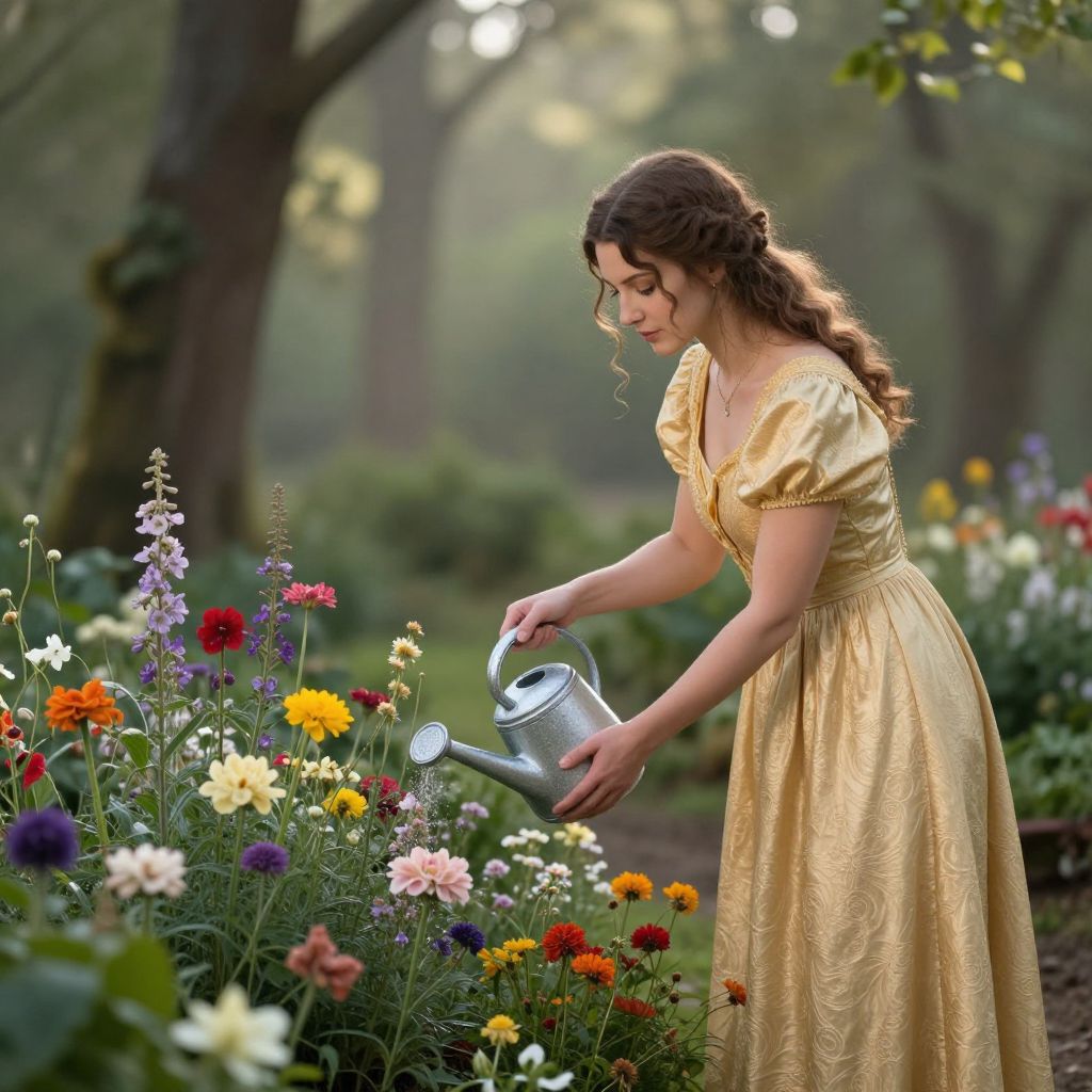 In a serene woodland garden bathed in soft morning light, a woman in a golden gown tends to vibrant blooms, her gentle watering gesture symbolizing renewal and the delicate balance between life's fleeting beauty and enduring cycles.
