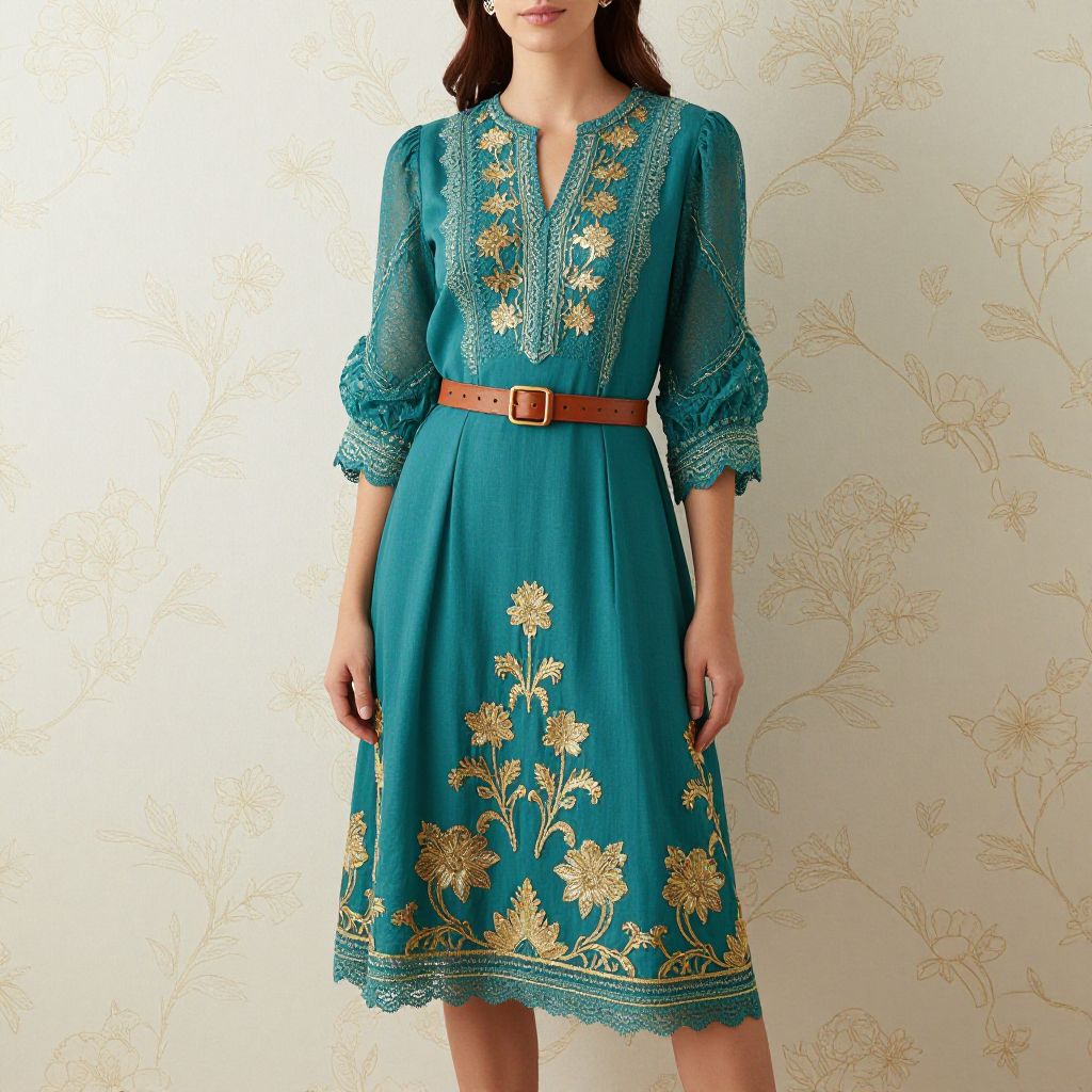 Elegant woman standing against a floral-patterned wall, wearing a teal dress adorned with gold floral embroidery, featuring lace detailing, puffed sleeves, and a brown leather belt cinched at the waist.