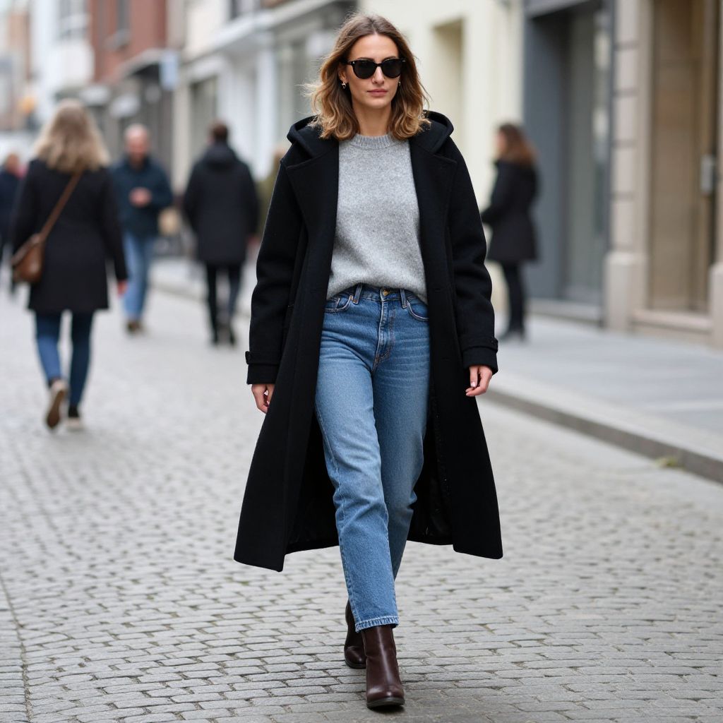 Photograph of a Caucasian woman with shoulder-length, wavy brown hair, walking down a cobblestone street. She wears dark sunglasses, a light gray knit sweater, high-waisted blue jeans, and a long black coat that reaches below her knees. She also has dark brown ankle boots. The background shows a slightly blurred urban scene with people in winter clothes, storefronts, and buildings on either side. The overall color palette includes neutral and dark tones, with the cobblestone street adding texture. The woman's confident stride and casual yet stylish outfit suggest a fashionable, urban setting.