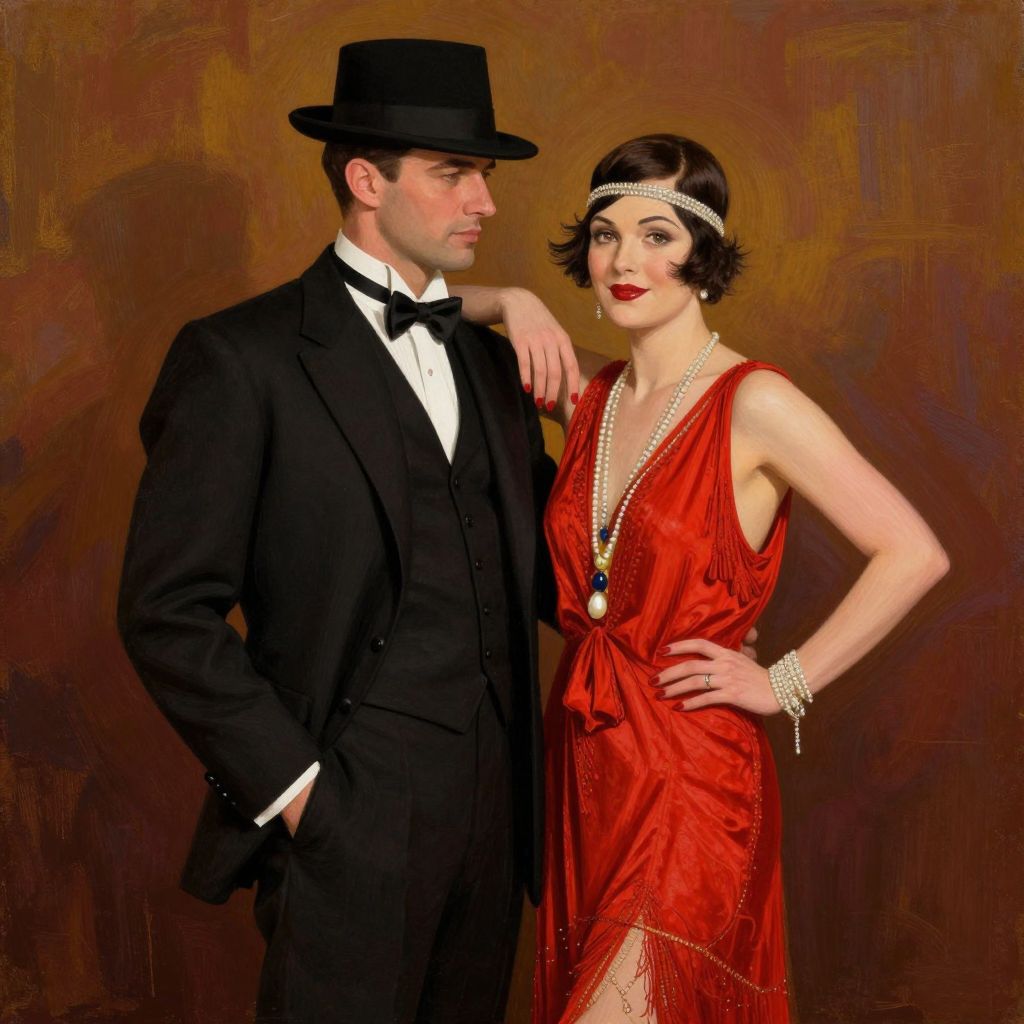 A vintage-inspired digital painting evokes the glamour of the Roaring Twenties, featuring a man in a classic black suit and hat alongside a woman in a striking red dress, set against a richly textured, warm-toned backdrop that captures the era's timeless elegance.