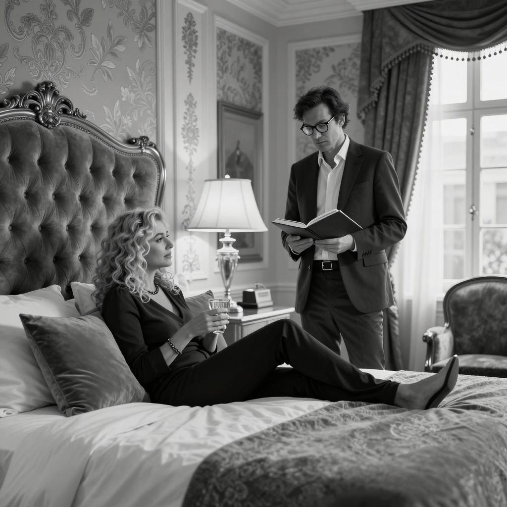 Black and white photograph. Woman with curly blonde hair and a dark top sits on a large, tufted headboard bed, holding a glass. Man with dark hair, glasses, and a suit stands beside the bed, holding a notebook. Luxurious bedroom with ornate wallpaper, two lamps, and large windows in the background.