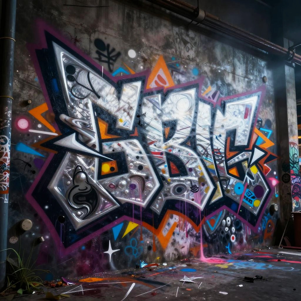 Graffiti generator 3d creating a surreal fusion of bold graffiti letters and abstract shapes, layered with metallic and glossy textures, animated brush strokes in motion, set against a dark urban alley with illuminated mist for a cyberpunk vibe
