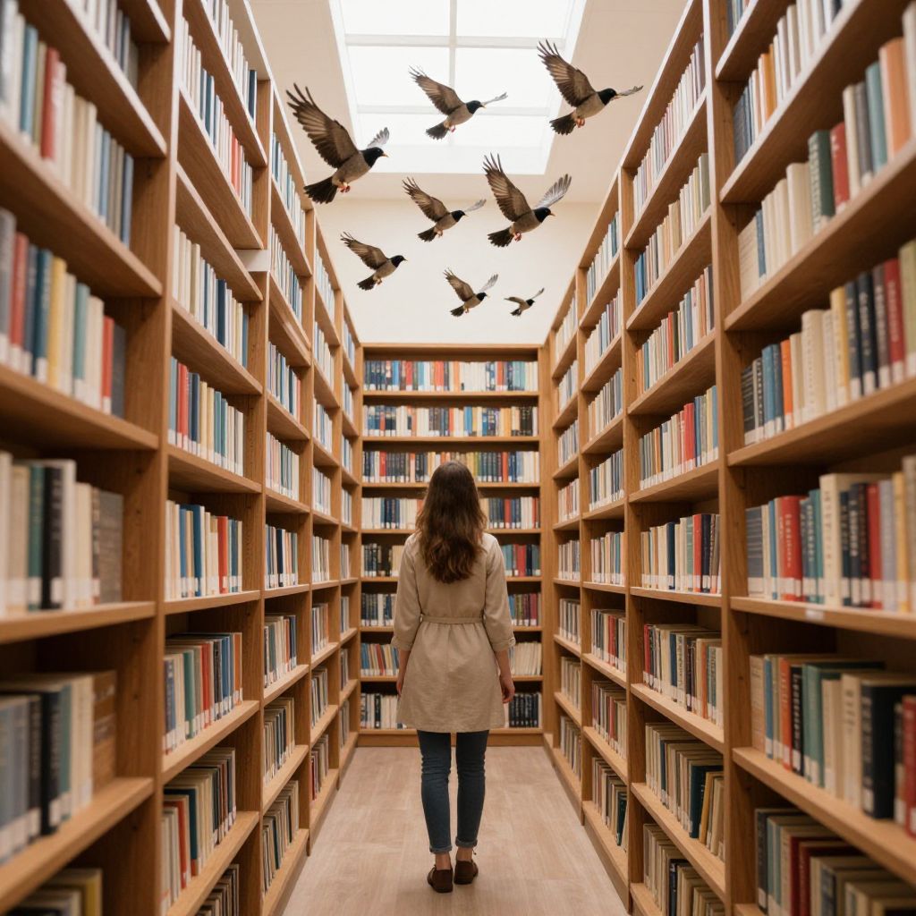 Woman exploring a sunlit library aisle, surrounded by towering wooden shelves filled with colorful books, while seven birds soar gracefully above her, casting a surreal blend of knowledge and freedom.