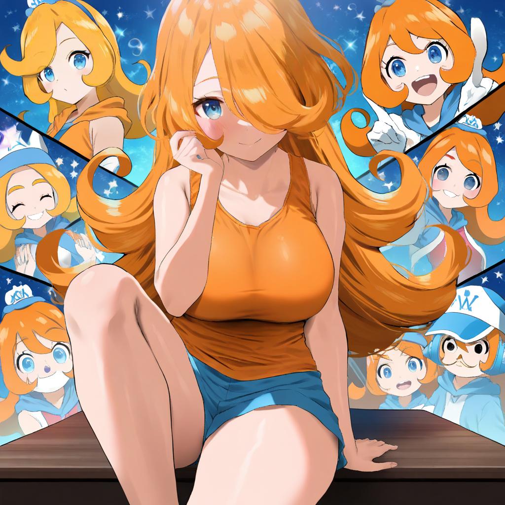 This digital anime-style illustration features a cute, blonde-haired girl with long, wavy hair, blue eyes, and fair skin. She wears a tight, orange tank top that accentuates her large breasts and blue shorts. She sits with one knee up and her hand touching her cheek, giving a shy or contemplative expression. The background is a vibrant blue with stars and smaller, chibi-style versions of her face in various expressions, including happy, surprised, and blushing. The overall composition is dynamic, with the chibi faces radiating from the central figure, adding a playful, energetic feel to the image.