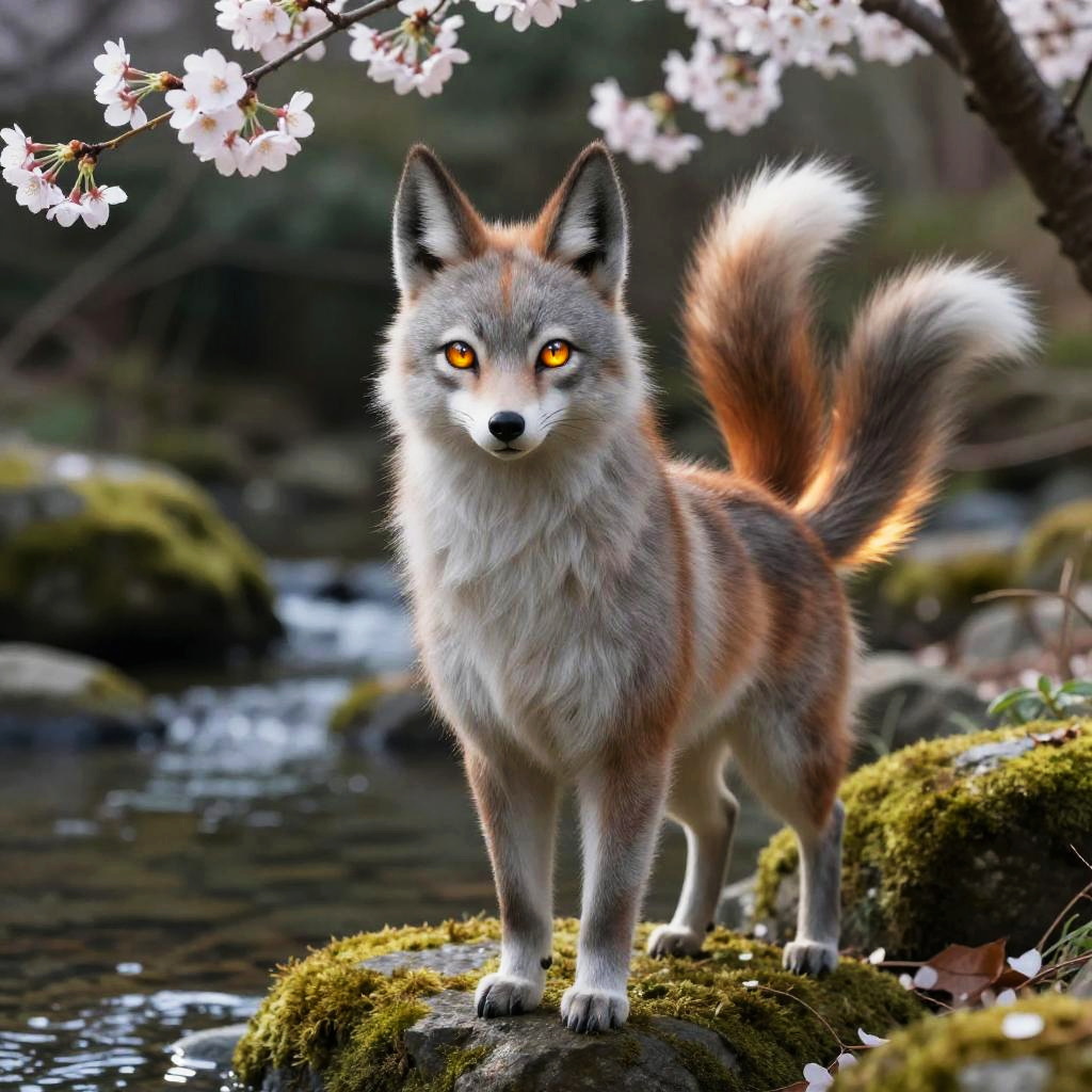 Realistic kitsune standing on moss-covered rocks by a tranquil stream, detailed amber eyes reflecting forest light, soft fur texture with subtle glowing tails, surrounded by sakura blossoms, serene and mystical atmosphere
