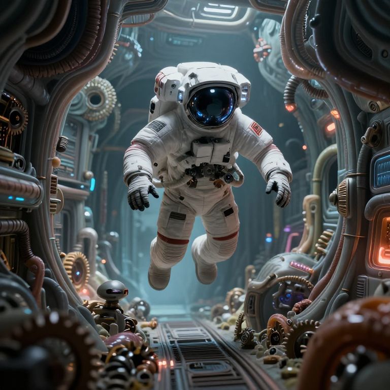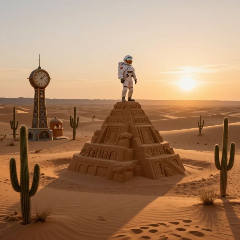 Photorealistic CGI: astronaut in scuba gear stands in a sand desert city with clock-faced skyscrapers, enclosed in a clear dome.