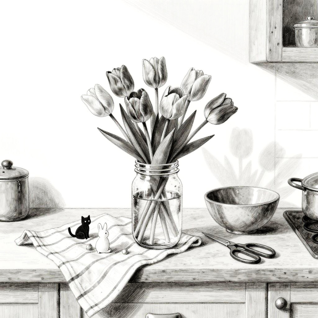 Black-and-white, whimsical hand-drawn still life on a sunlit kitchen counter, centered on mason jar filled with fresh cut tulips. Arranged around it: a striped linen cloth, ceramic fruit bowl, pair of scissors. Tiny figurines of a cat and a rabbit add charm. Background is minimal, a few lines suggesting a wall and horizon. Soft shading, gentle crosshatching, delicate line art, balanced negative space, subtle paper grain, calm studio light, sketchbook aesthetic.