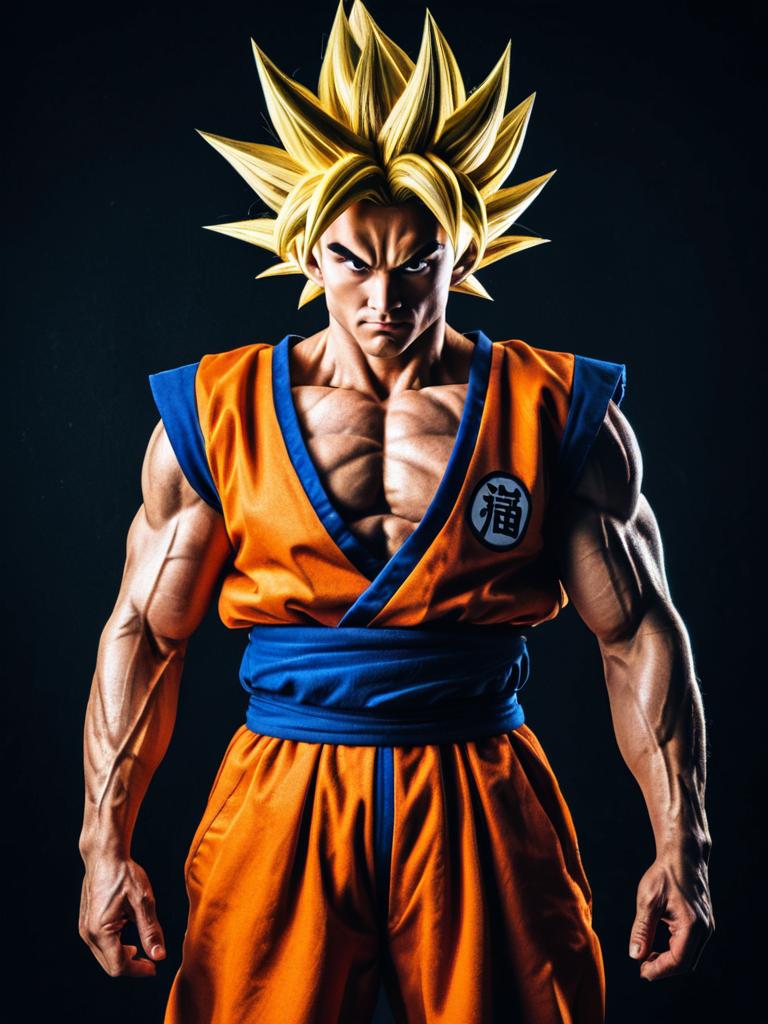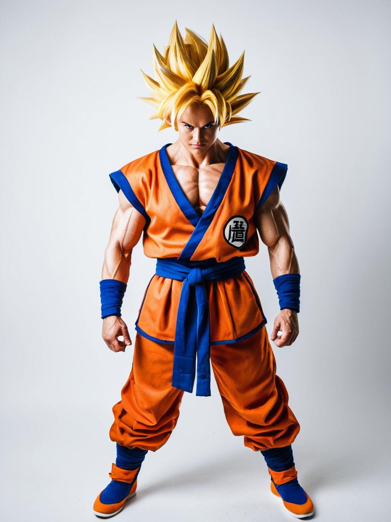 Man in Goku Super Saiyan Costume, photorealistic detailed studio portrait