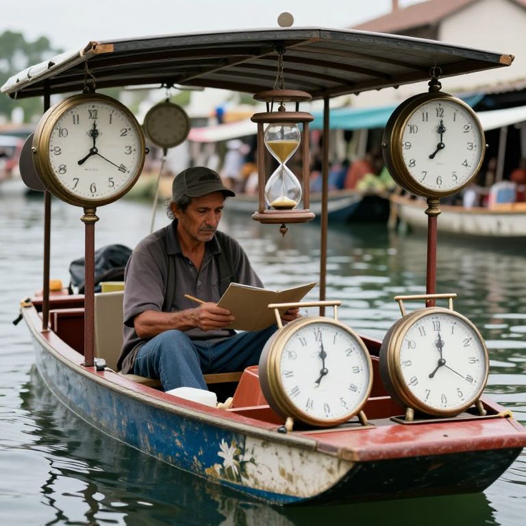 Photograph of a middle-aged man with a medium build, wearing a gray shirt, blue jeans, and a black cap, sitting in a small wooden boat on a calm river. The boat is adorned with four large, round, white clock faces showing different times, and a central hourglass. The man is reading a paper while seated on a wooden bench. The boat's roof is covered with a dark wooden slat. In the background, there are blurred figures and boats, suggesting a bustling riverside market. The water is reflective, and the overall scene has a vibrant, slightly saturated color palette.