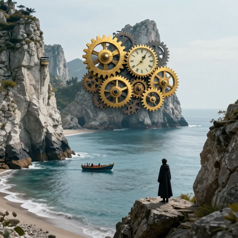 Majestic stone cliffs rise above a tranquil ocean, adorned with an intricate assembly of interlocking gears and multiple golden clocks, as a lone figure in a dark cloak observes the surreal scene from a rocky outcrop, while a small boat drifts peacefully near the shore.