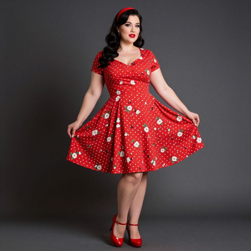 A stylish plus-size woman showcases a vibrant red cotton dress adorned with cherry floral print, embodying a retro vintage aesthetic with a rockabilly pinup flair, complemented by bold red heels and dramatic lighting that enhances the garment's classic charm.